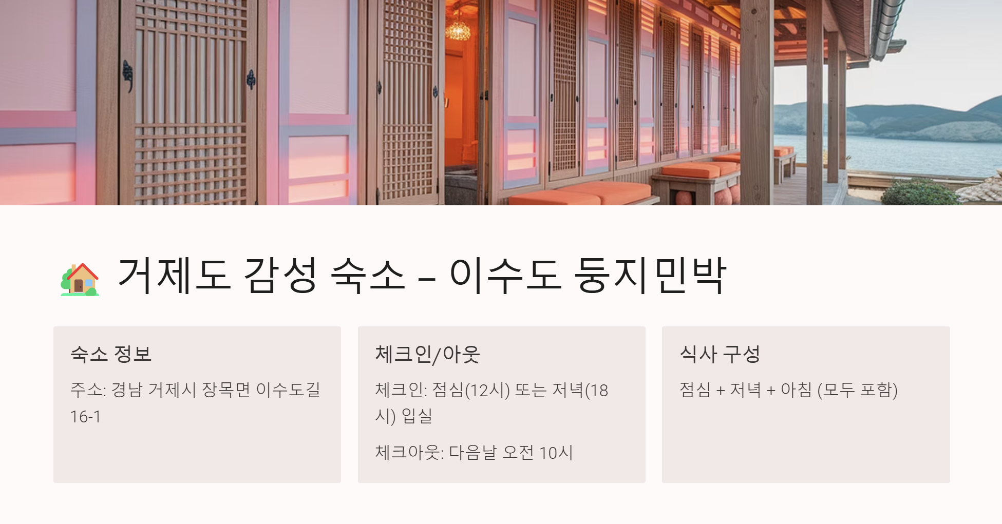 🏡 거제도 감성 숙소 – 이수도 둥지민박 1박3식 구성