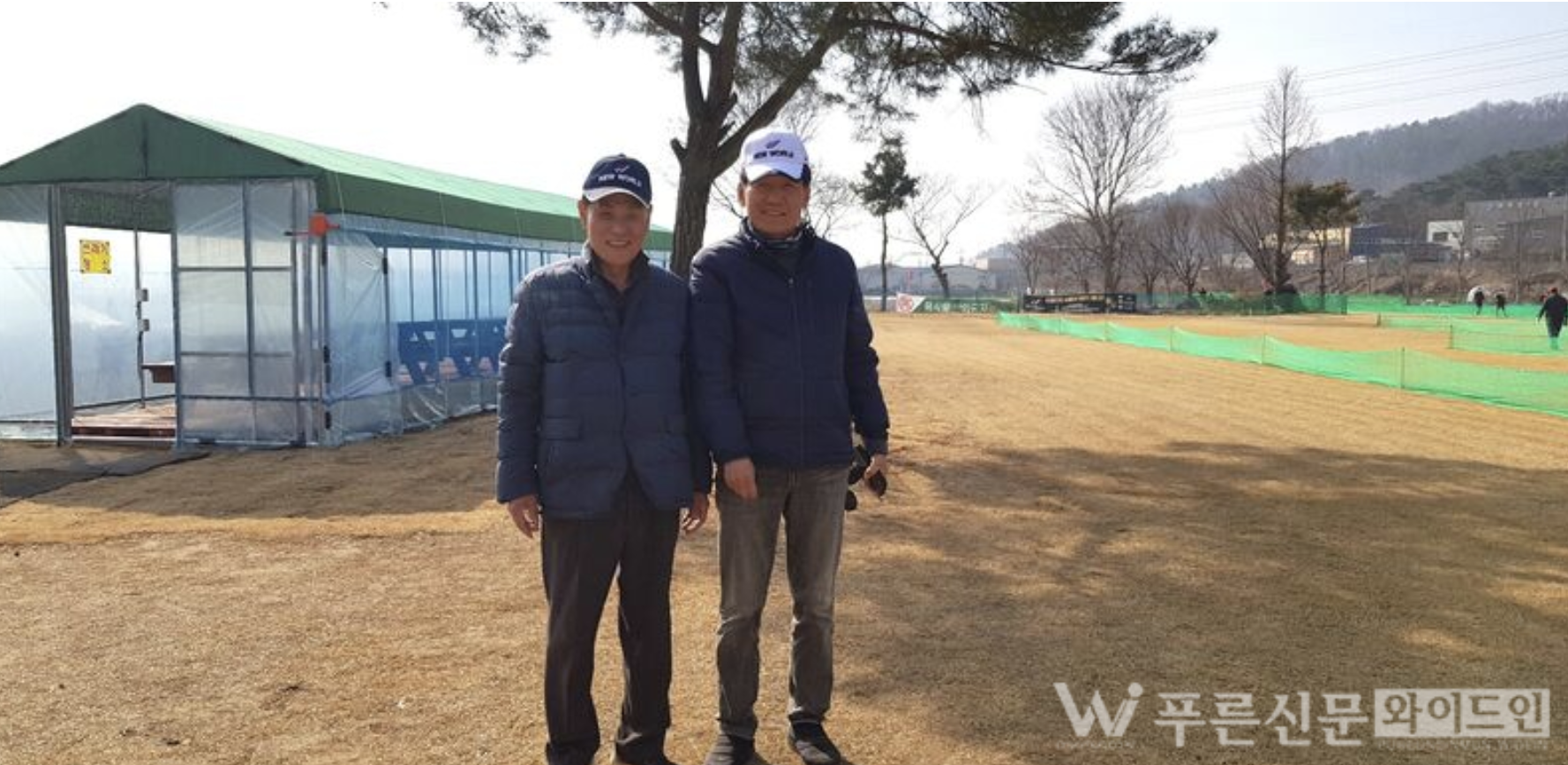 ▲뉴월드파크골프 윤동희 회장(왼쪽)과 신준경 시설이사. 〔사진=김영조 기자〕대부분의 파크골프장이 잔디 생육 관리와 시설 보완 및 정비를 위하여 휴장을 하는 3,4월에도 문을 여는 파크골프