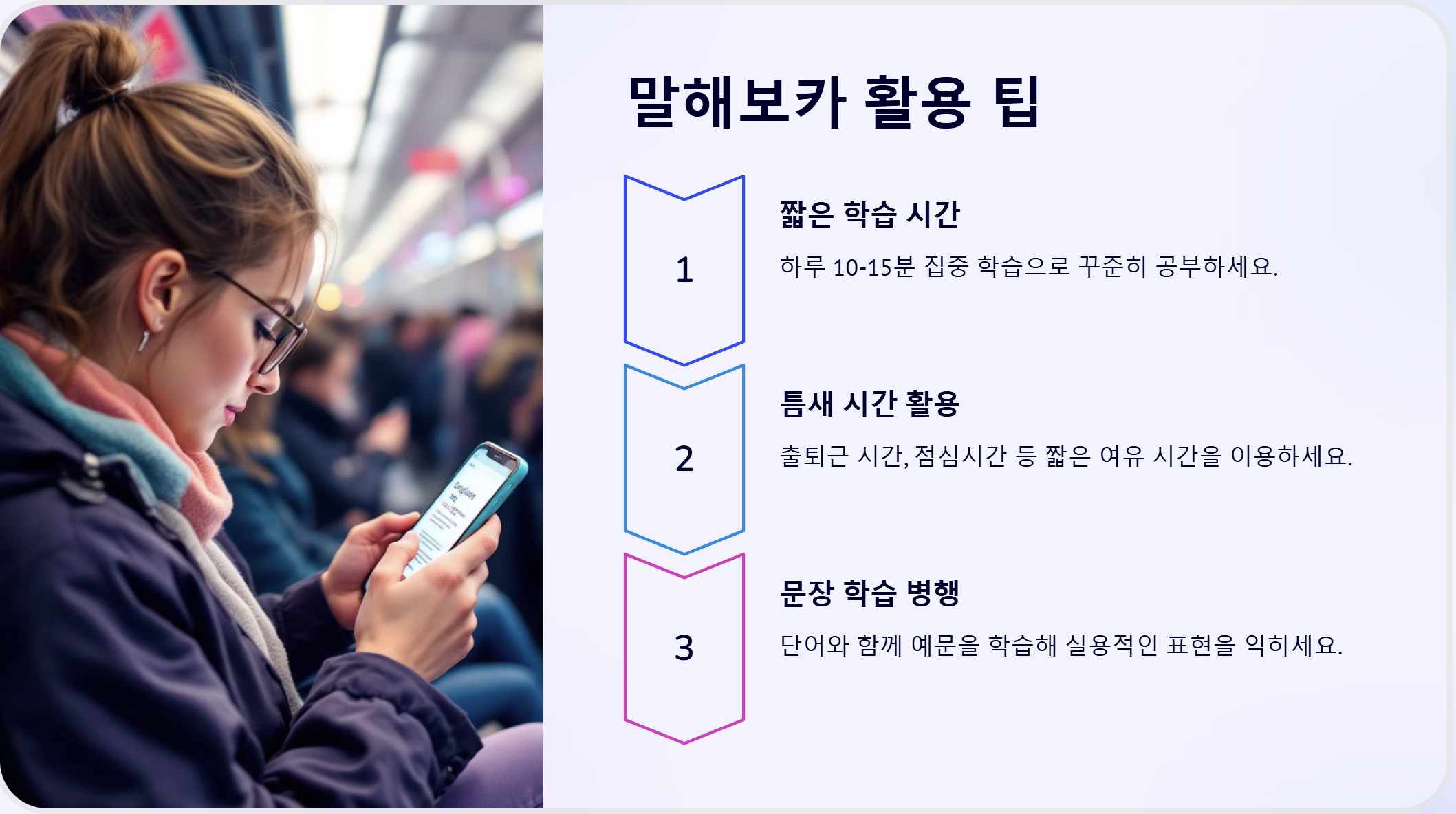 출퇴근 시간, 점심시간, 잠들기 전 5분 등 짧은 여유 시간을 활용하세요. 언제 어디서나 학습이 가능한 모바일 환경은 말해보카의 큰 장점입니다.