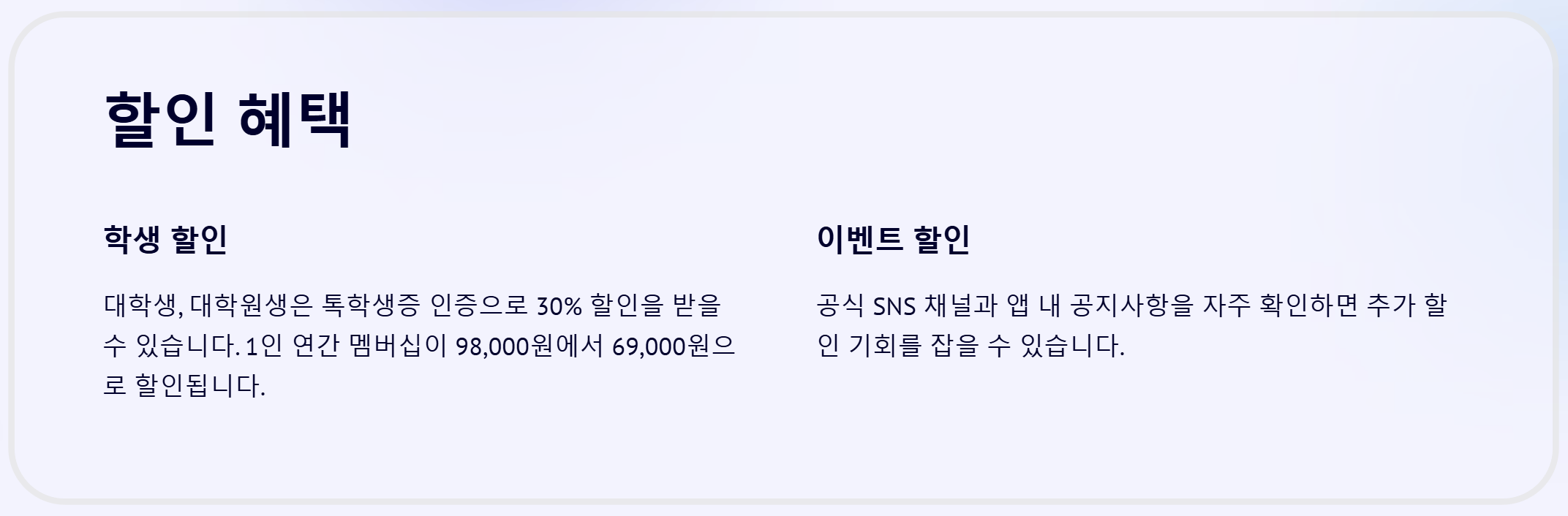 - 1인 연간 멤버십: 98,000원 → 69,000원