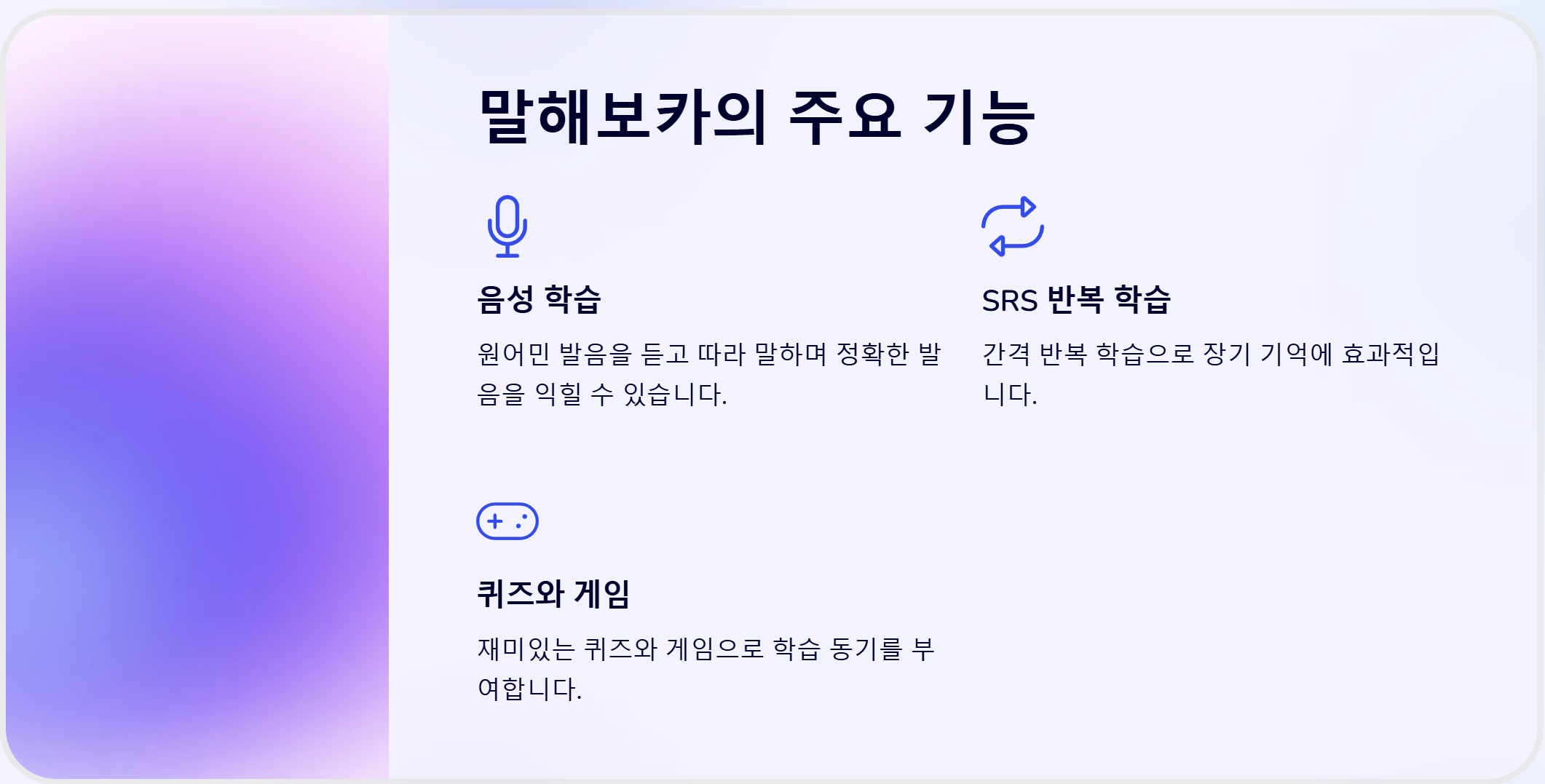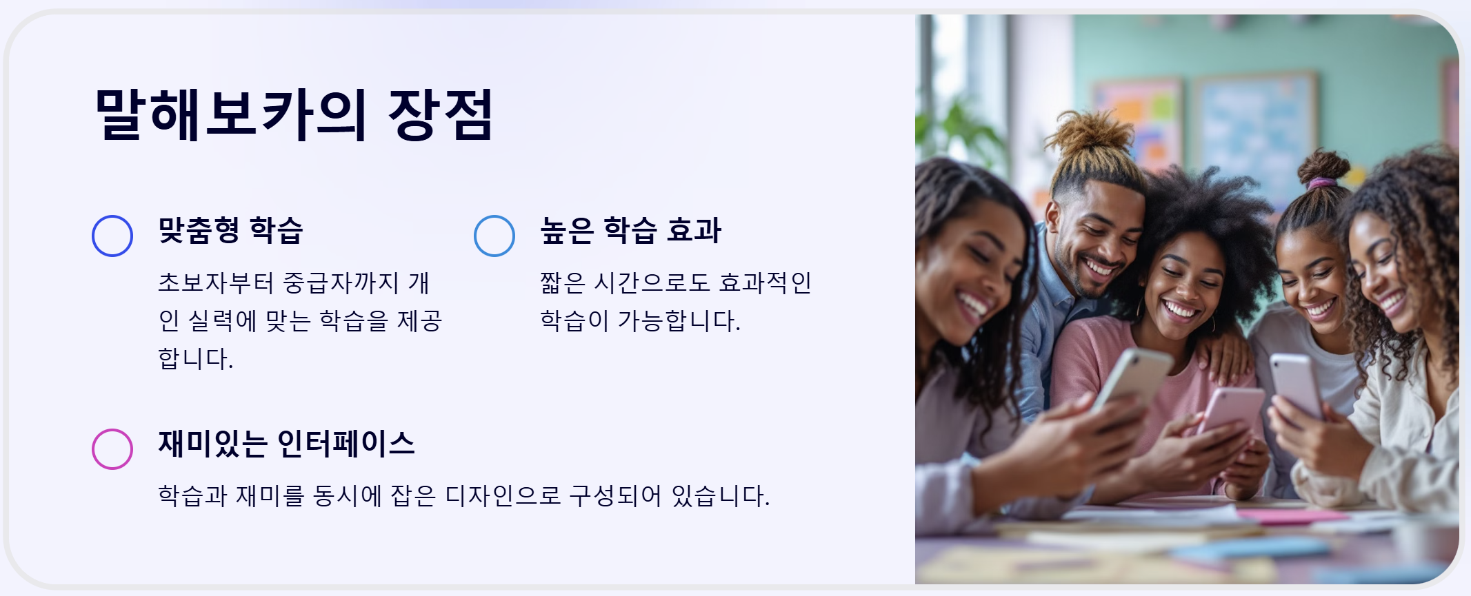 말해보카는 단순한 영어 학습 앱이 아닙니다. 학습자 개개인의 실력에 맞춘 맞춤형 학습을 지원하며, 초보자부터 영어 중급자까지 누구나 손쉽게 사용할 수 있습니다. 단어 암기와 발음 연습은 물론, 반복 학습과 성취감 제공을 통해 꾸준히 학습할 수 있는 환경을 제공합니다.