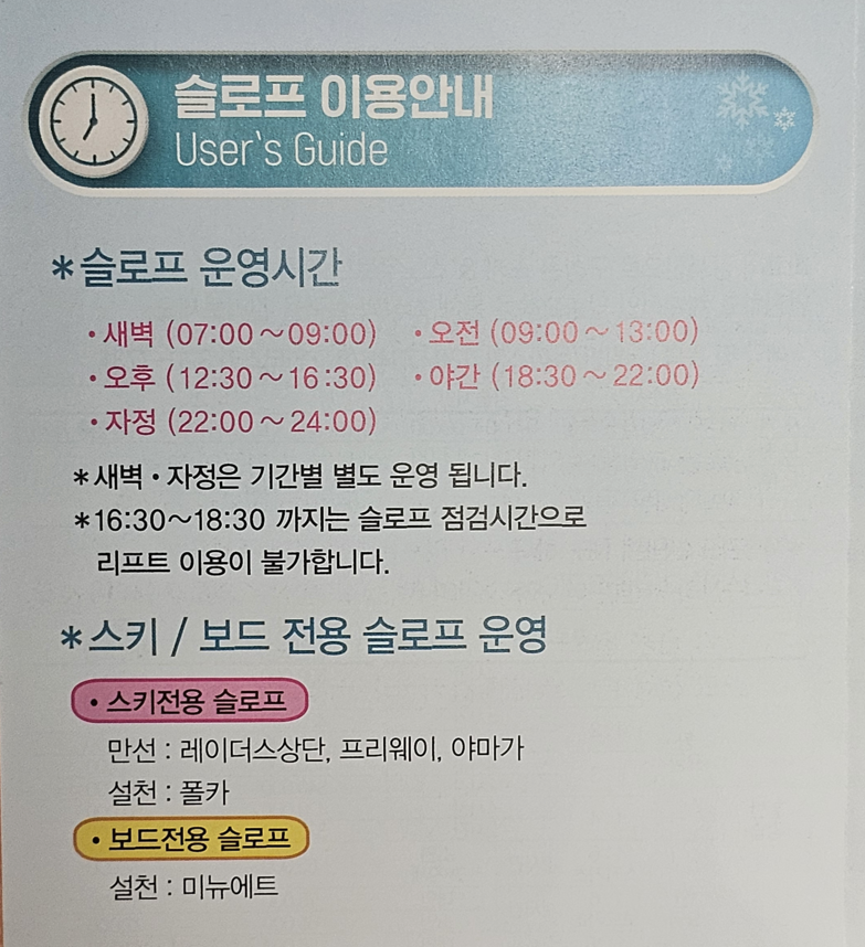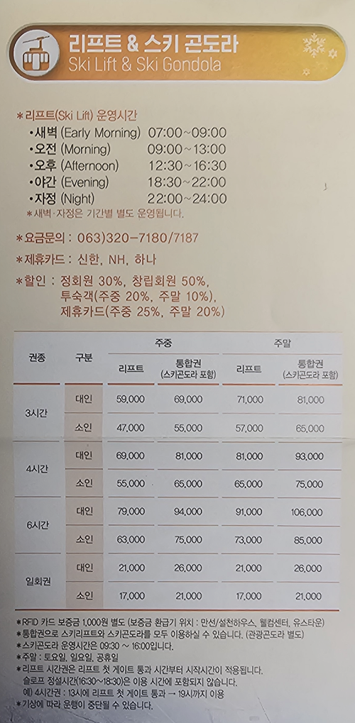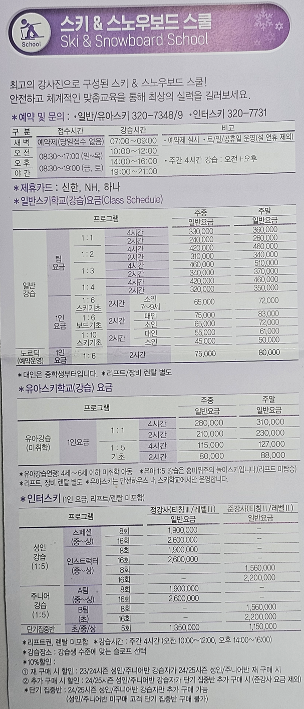 - 장비 및 복장 할인: 이쁜 스키복, 보드복, 헬멧, 장비(스키/보드) 할인 제공.