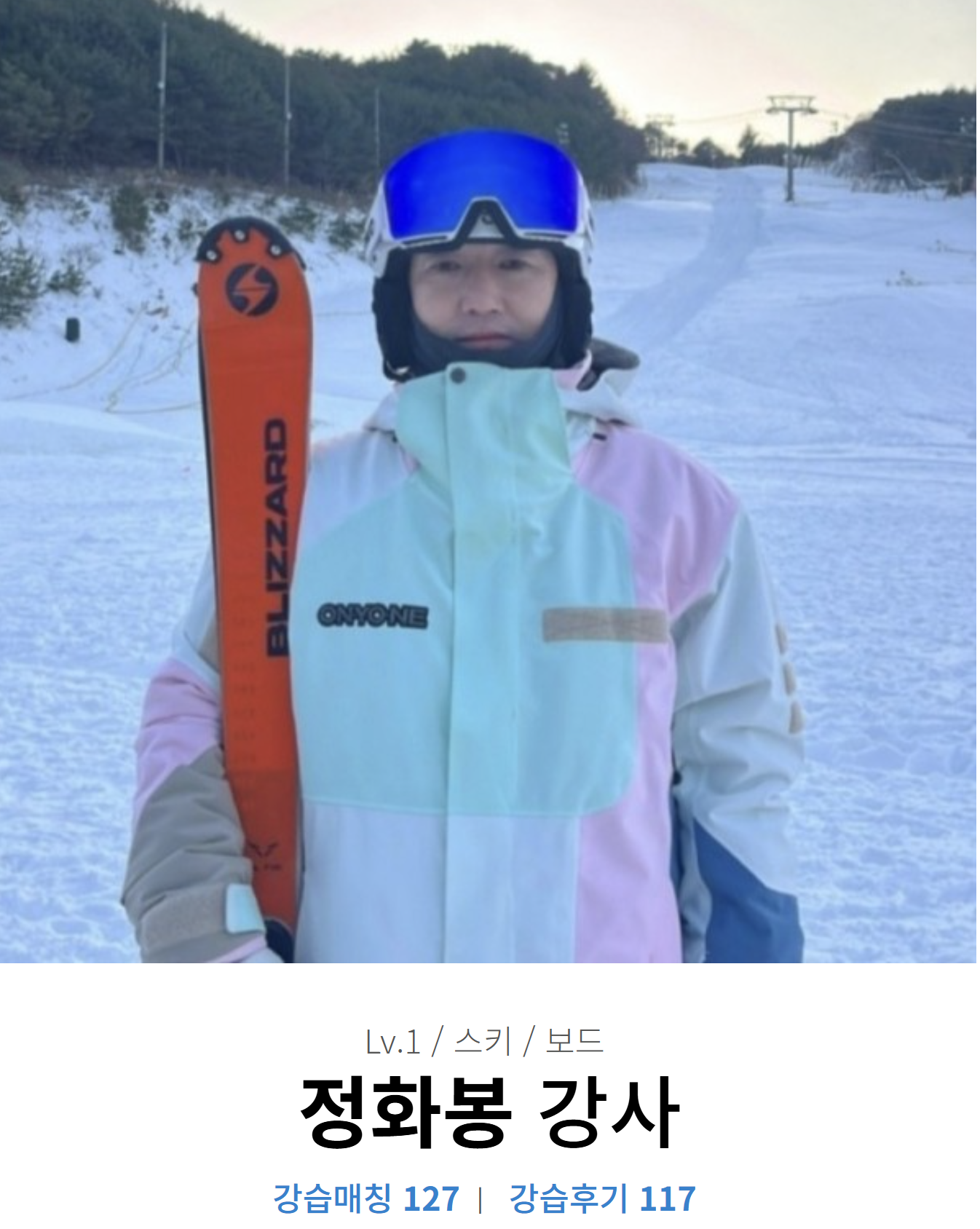 "정화봉 강사님을 강력히 추천합니다! 초등학교 2학년 오경이에게 딱 맞는 눈높이 교육과 1:1 맞춤 강습을 해주셔서 아이가 정말 즐겁게 배웠습니다. 연륜이 느껴지는 최고의 강사님 덕분에 오경이가 너무 만족하며 다음에도 강사님께 배우고 싶다고 하네요. 스키 강습을 고민 중이시라면 정화봉 강사님 강추입니다!"