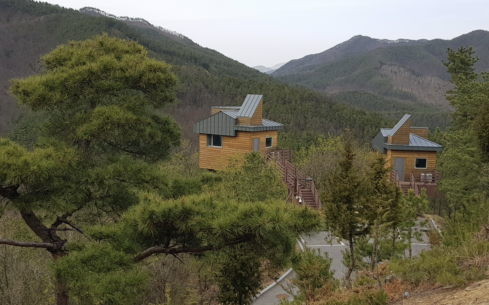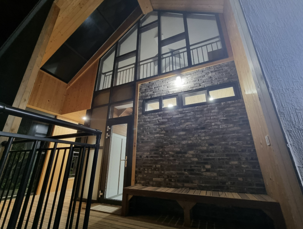 ✅ 특징: 전통적인 나무집 스타일, 작은 테라스 포함, 주변에 나무가 많아 프라이빗함 제공