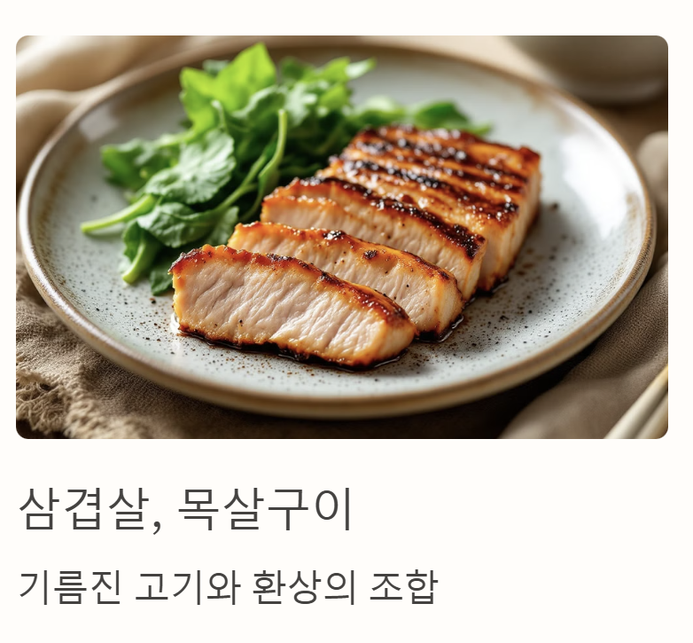 ✔ 삼겹살, 목살구이 – 기름진 고기와 환상의 조합!