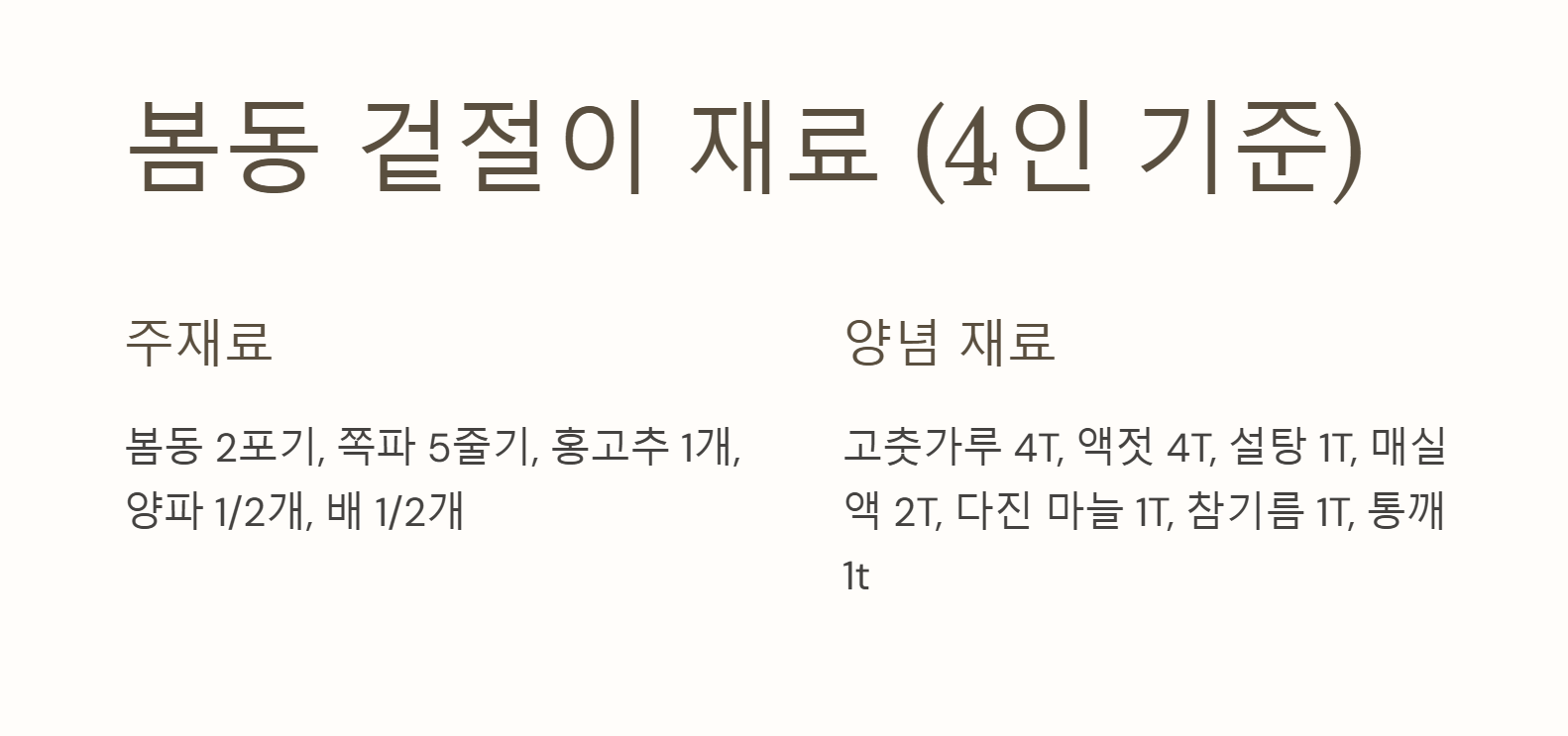 - 봄동 2포기 (배추처럼 생긴 채소로, 마트에서 쉽게 구할 수 있어요!)