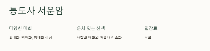 - 추천 포인트: 한적한 분위기, 사찰과 매화가 어우러진 아름다운 풍경