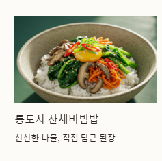 - 특징: 신선한 나물과 직접 담근 된장으로 만든 건강한 한식