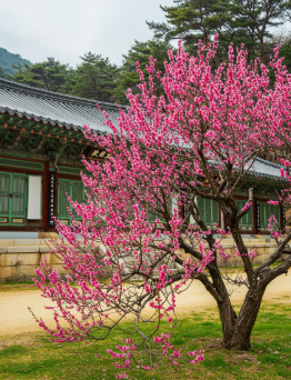 - 홍매화와 전각이 함께 보이는 곳에서 촬영하면 전통적인 분위기를 더욱 살릴 수 있어요.