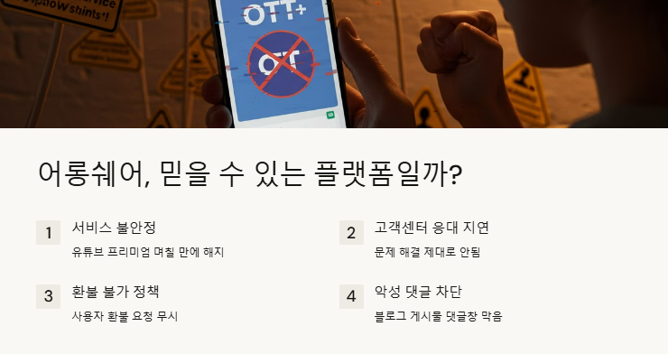 이러한 문제로 인해 OTT 공유 플랫폼을 찾는 사용자들 사이에서 "어롱쉐어는 피해야 할 플랫폼"이라는 경고가 확산되고 있다.