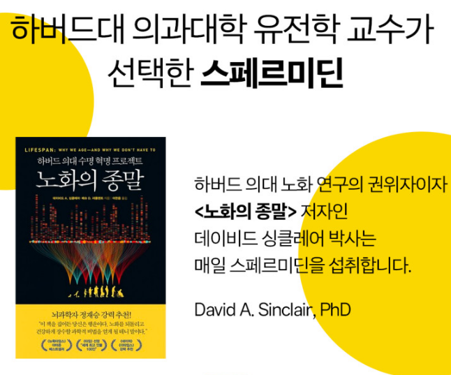 효모 스페르미딘은 자연 유래 성분으로, 세포 성장과 자가포식을 활성화하는 폴리아민(polyamine) 성분입니다. 특히, 하버드 의대 싱클레어 박사도 노화 방지를 위해 매일 스페르미딘을 섭취한다고 밝혀 더욱 신뢰를 얻고 있습니다.