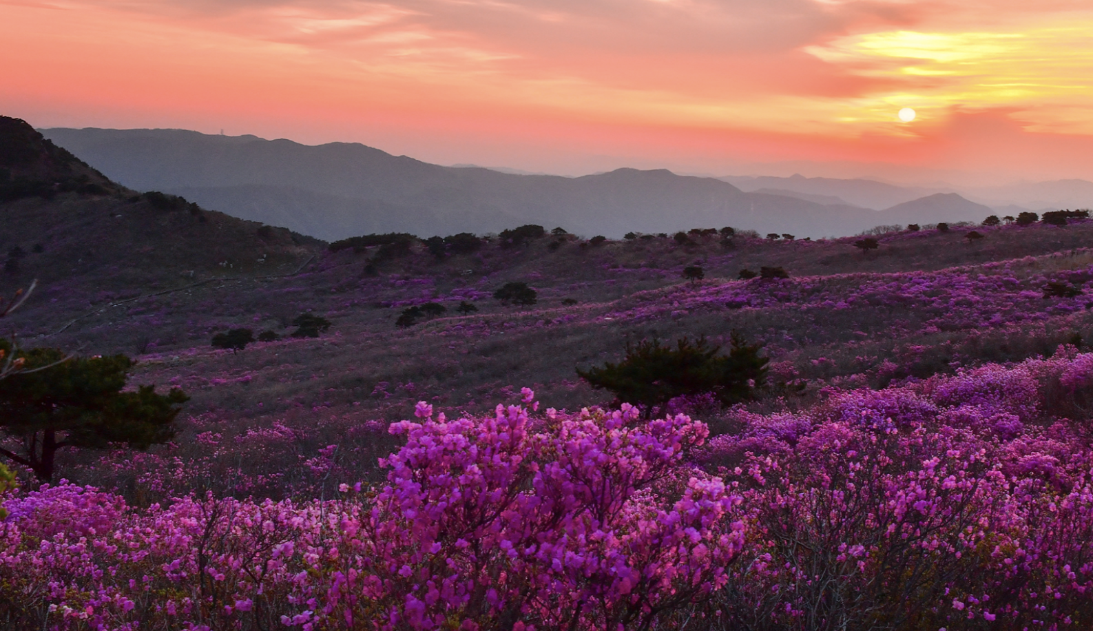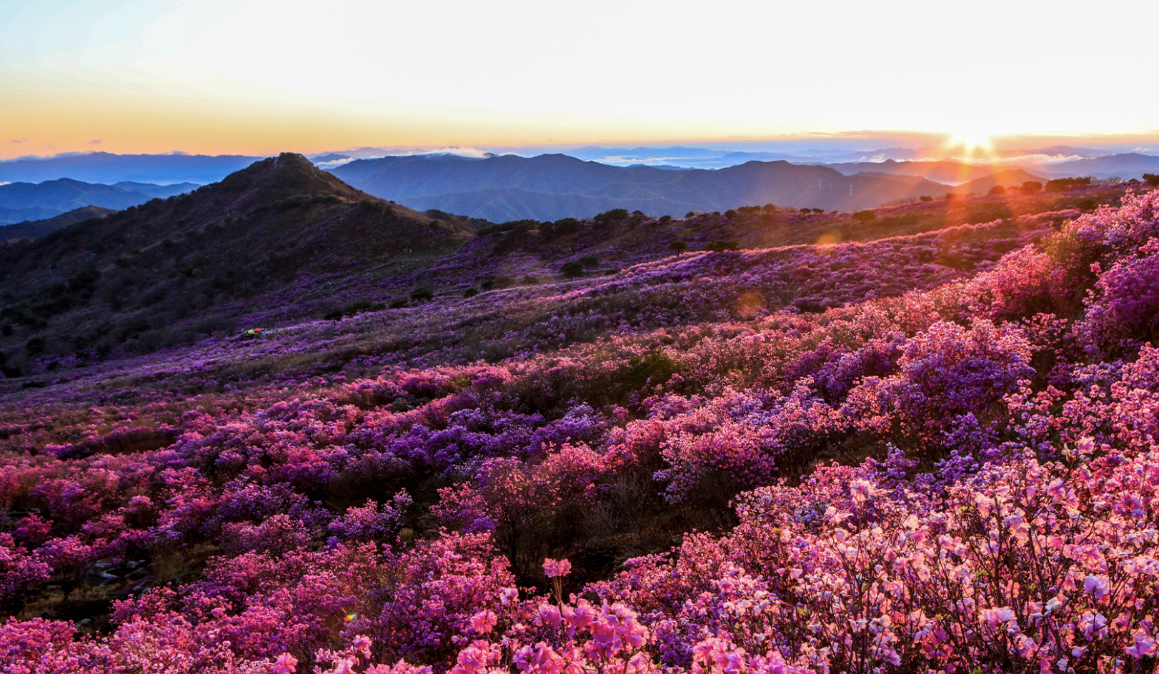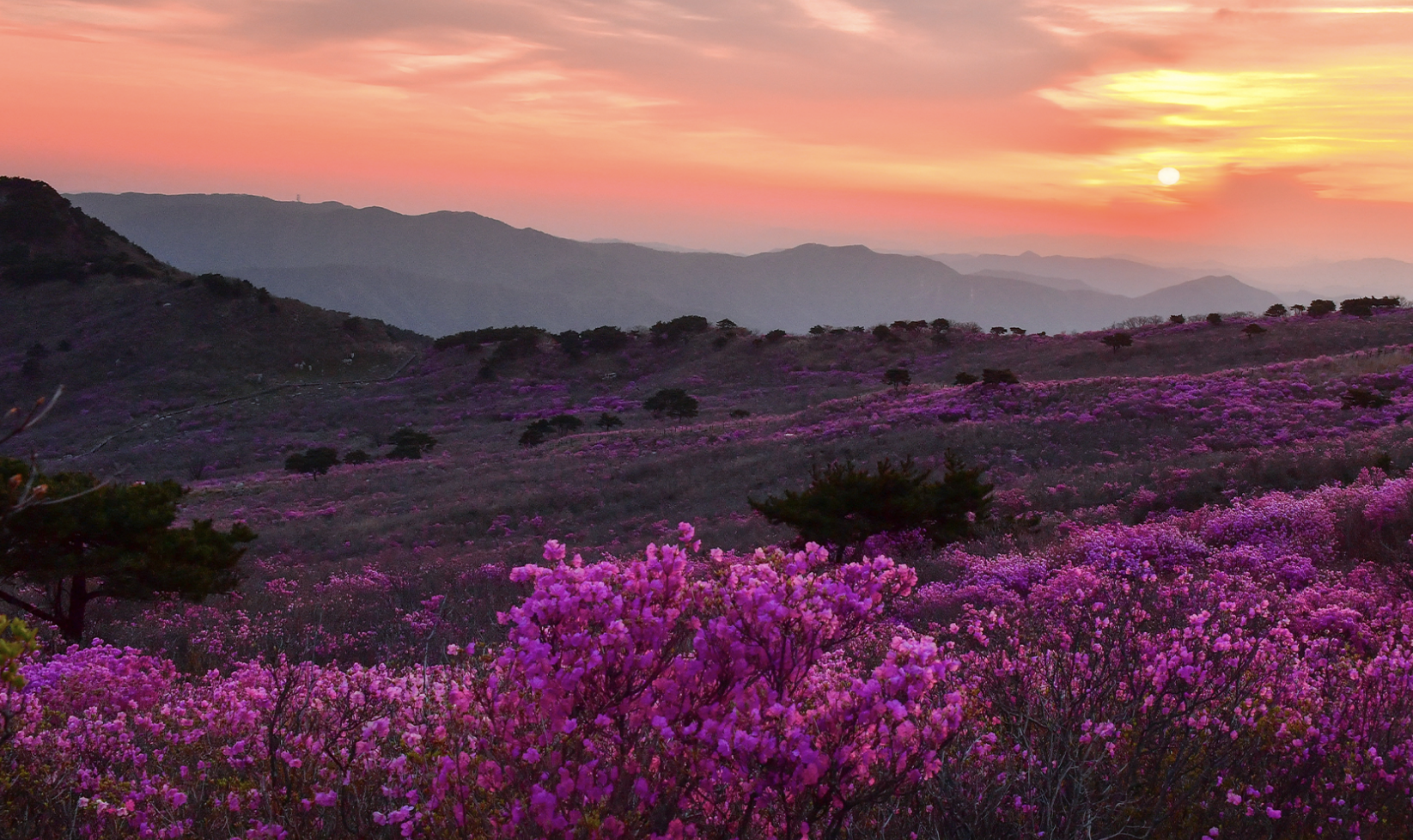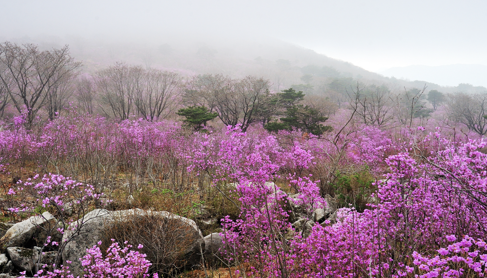 비슬산 참꽃(진달래)은 매년 4월 중순부터 활짝 피기 시작하여 4월 말경 절정을 이룹니다.