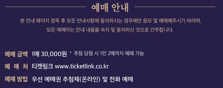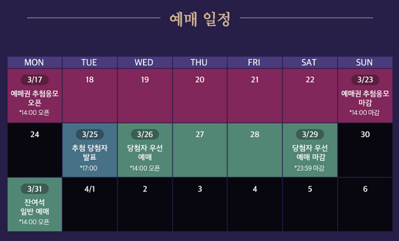 | 당첨자 우선 예매 | 3월 26일(수) 14:00 ~ 3월 29일(토) 23:59 |