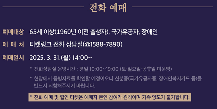 - 티켓링크에서만 예매 가능 (현장 판매 없음)