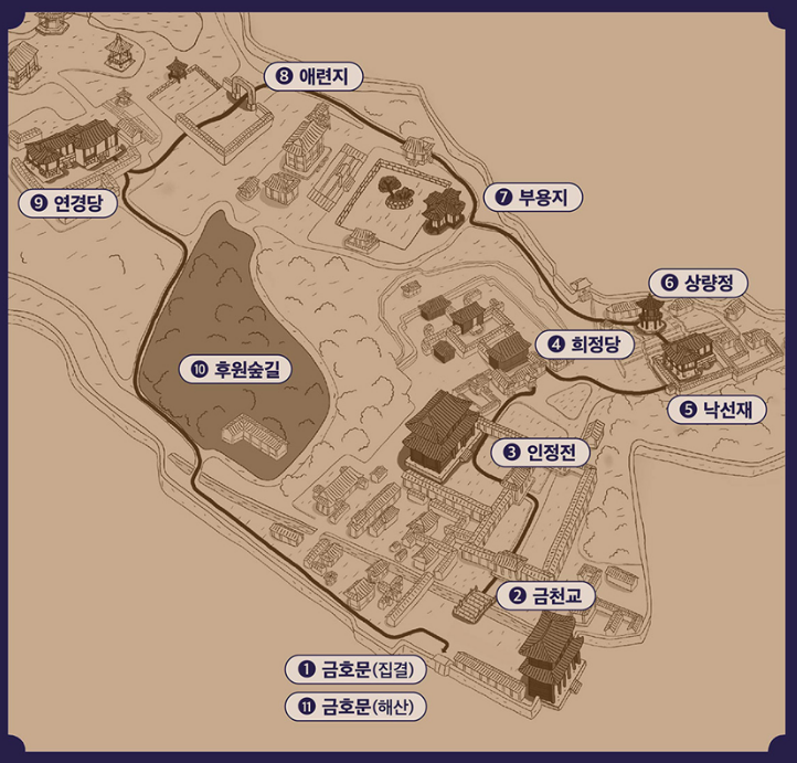 - 금호문(집결) → 금천교 → 인정전 → 희정당 → 낙선재 → 상량정 → 부용지 → 애련지 → 연경당 → 후원 숲길 → 금호문(해산)