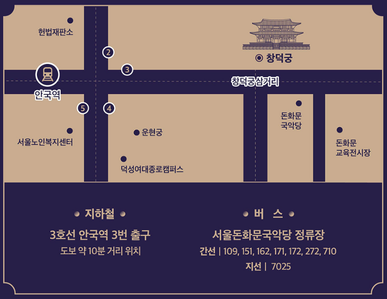- 3호선 안국역 3번 출구 → 도보 약 10분