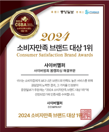 특히, 사이버헬퍼는 2024년 중앙일보 사이버범죄 해결 부문 소비자만족 브랜드 대상 1위를 차지한 믿을 수 있는 보안 서비스입니다.