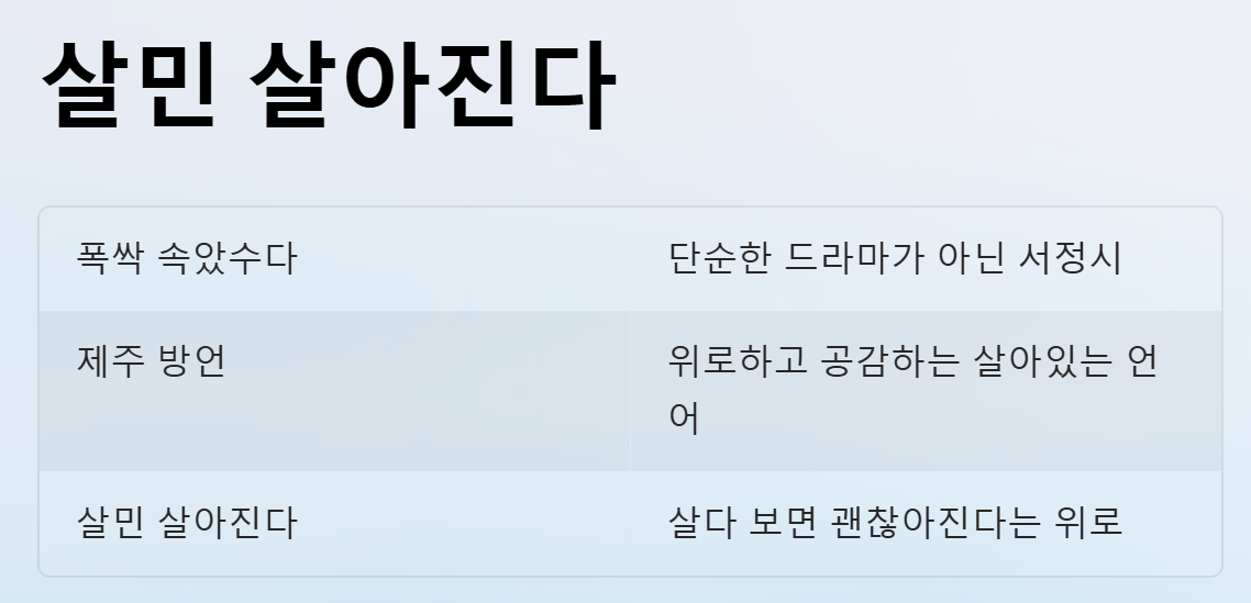 〈폭싹 속았수다〉는 단지 제주어를 사용하는 드라마가 아닙니다. 언어를 매개로 제주도의 문화, 가족, 사랑, 시련과 회복을 그리는 이야기입니다. 특히 다음과 같은 점이 주목할 만합니다:
